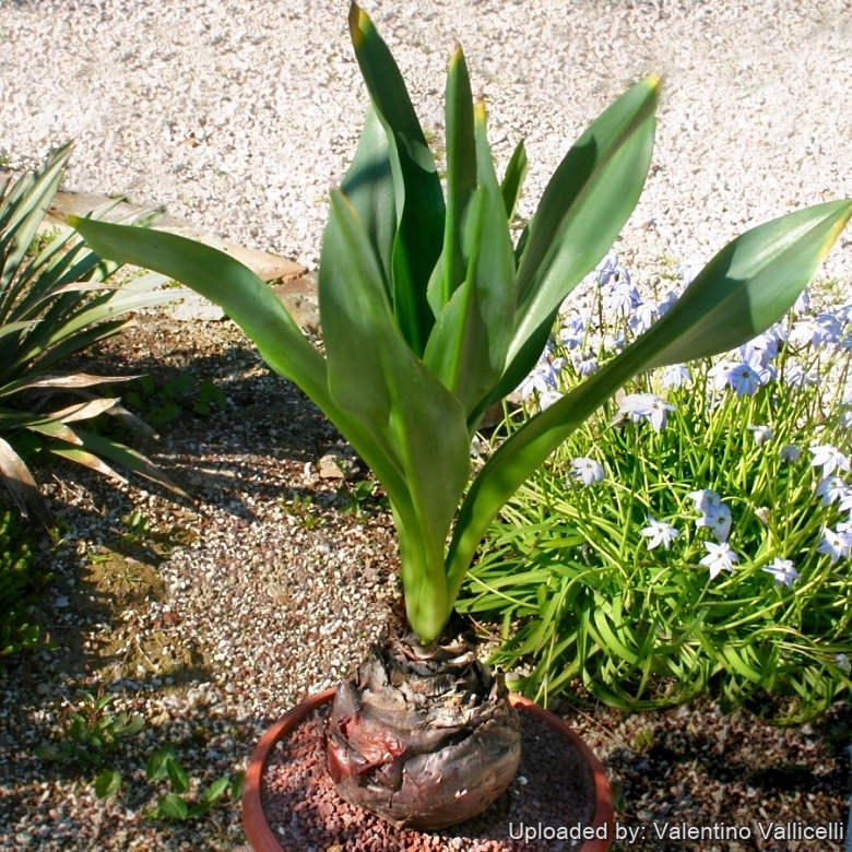 Bulb: Pyriform with several layers of papery tunics that protect the bulbs from the sun. The bulbs split dichotomously from the apex rather than forming basal offsets and in time they grow to massive clumps up to 20 heads, each one from 12 to 20cm in diameter and weigh 2 to 3,5 kg. The form with brown reddish outer tunics, is sometime referred as var. rubra and gets to be a bigger size. The other form has whitish outer tunics and is referred as var. alba. The big bulbs can last for dozen of years.