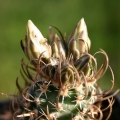 Stem: Dark green, cylindroid or slightly obconic, 2,5-7.5 ( or more) cm tall and 1-2(-4) cm in diameter. It has no ribs and tubercles are elongate, 1.5-5 mm long, dark grey-green, rather soft but usually is obscured by the spines;.