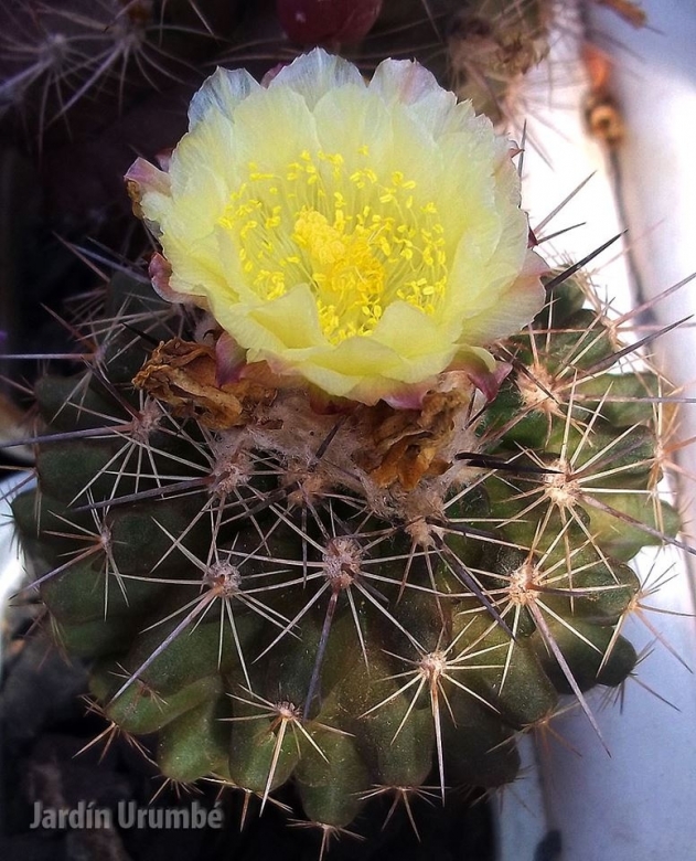 Areoles: Big, oval about 4 mm long and 10 mm apart, covered with white wool turning grey, later glabrous.