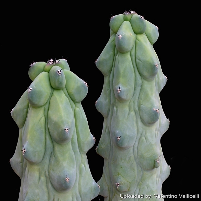Description: The standard Myrtillocactus geometrizansSN|8050]]SN|8050]] (a.k.a "Blue Candle Cactus") is a very popular candelabra-like tree cactus often sold in garden centres widely used for grafting stock. Instead the Japanese cultivar 'Fukurokuryuzinboku' is a strange monstrous form and a very rare and priced collector item. Its vernacular English names "Breast cactus" or "Titty cactus" comes from the particular shape of the tubercled ribs that resemble women breasts. This plant - apart from the breasts - is similar in all other features to the common "Blue Candle" and can grow up to 4.5 m tall, with the crown reaching up to 5 m in width.