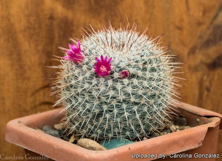 Description: Mammillaria muehlenpfordtiiSN|18456]]SN|18456]] is a massive globose cactus with bright carmine flowers. It is solitary when young, but each single stem begins to divide dichotomously to form two stems as it matures, this process repeats several times giving rise to small clustered groups and occasionally to large mounds with dozen of heads. Seen from above the central whorl of woolly areoles resembles a sunflower head.