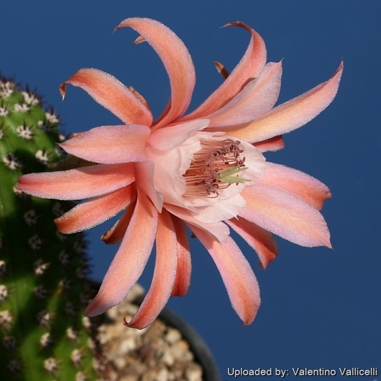Description: Cleistocactus cv. Nolle 2SN|3784]]SN|21271]] (best known as Hildewintera cv. Nolle 2SN|21272]]SN|21272]]) is a cute little prolific clumping cactus with arching, or trailing stems that can grow up to 1 m long and about 4 cm wide with many branches. It is an hybrid plant involving Cleistocactus winteriSN|21271]]SN|3784]] (the Golden Rat Tail) and an unknown Echinopsis sp. It produces a profusion of beautiful medium sized pink flowers at a time, and is quite a sight. Magnificent bloomers, the flowers can endure for two-three days (depending on temperature and sun exposure).