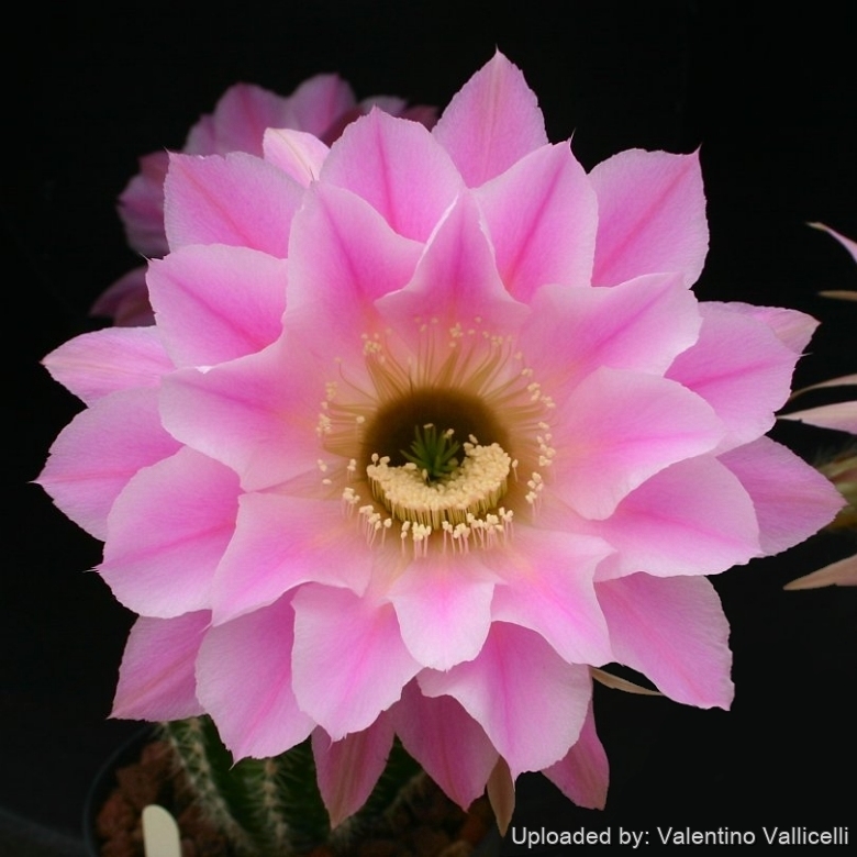 Echinopsis cv. Eddie: has delicate pink blooms with fine pink outer margin, light pinkish-red basal stripe and salmon-pink darker midrib.