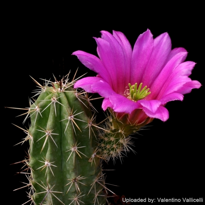 Flowers: Purple-red to pink in varying shades, and diurnal. Blooming in spring (April-May). Similar in size or larger , to 8 cm long and 10 or more cm in diameter, compared to those of var. enneacanthus. Throat darker red. Filaments greenish or pinkish. Anthers yellow. Stile to 3 cm long, 1.5-2 mm thick with 6-12 green stigma lobes.