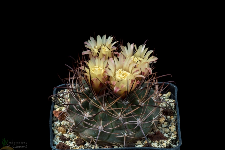 Flowers: Small, wide funnel-shaped with spreading limb, creamy-white flushed pink. Pericarpel scaly (like in gymnocalyciums) without bristles or spines. Tube short pale to very dark pink.