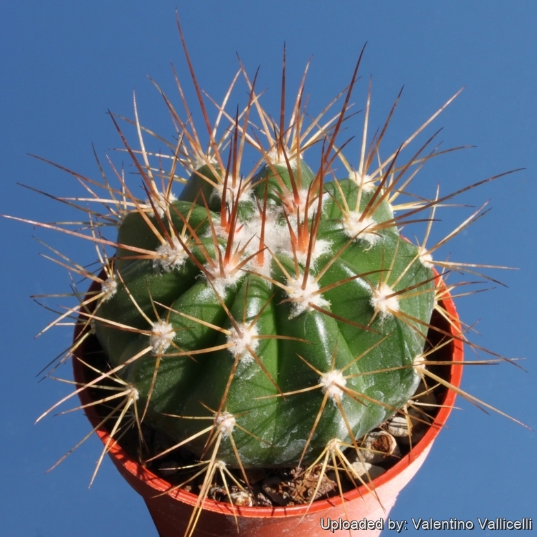 Stem: Spherical to depressed conical to ellipsoid to short cylindrical, distinctly mucilaginous, light yellowish green to dark green, (8-)9-25(-45) cm high, (7-)12-22(-25) cm in diameter. When the plant has reached a certain age it shows at the growing tip a cephalium (the structure, where the flower buds will form.