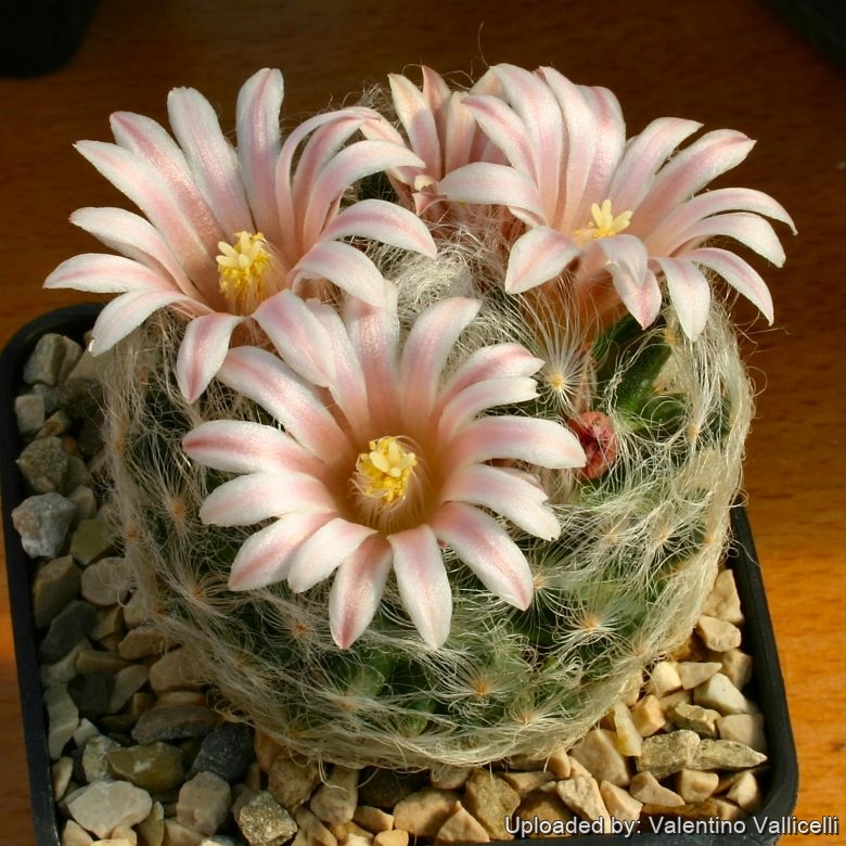 Flowers are large and pink ( but also white or cream coloured) (Mammillaria aureilanata) Photo by: Cactus Art