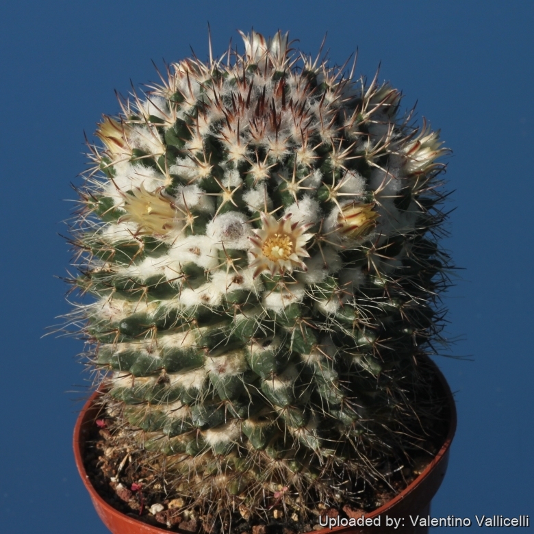 Description: Mammillaria voburnensisSN|20736]]SN|25920]] (Sometimes wrongly spelled “woburnensis”), is a freely clustering cactus with yellow 'snowy' tomentum near the top. This species forms mounds up to 30 centimetres high and wide. It was firstly described in 1845 by Frederick Scheer.