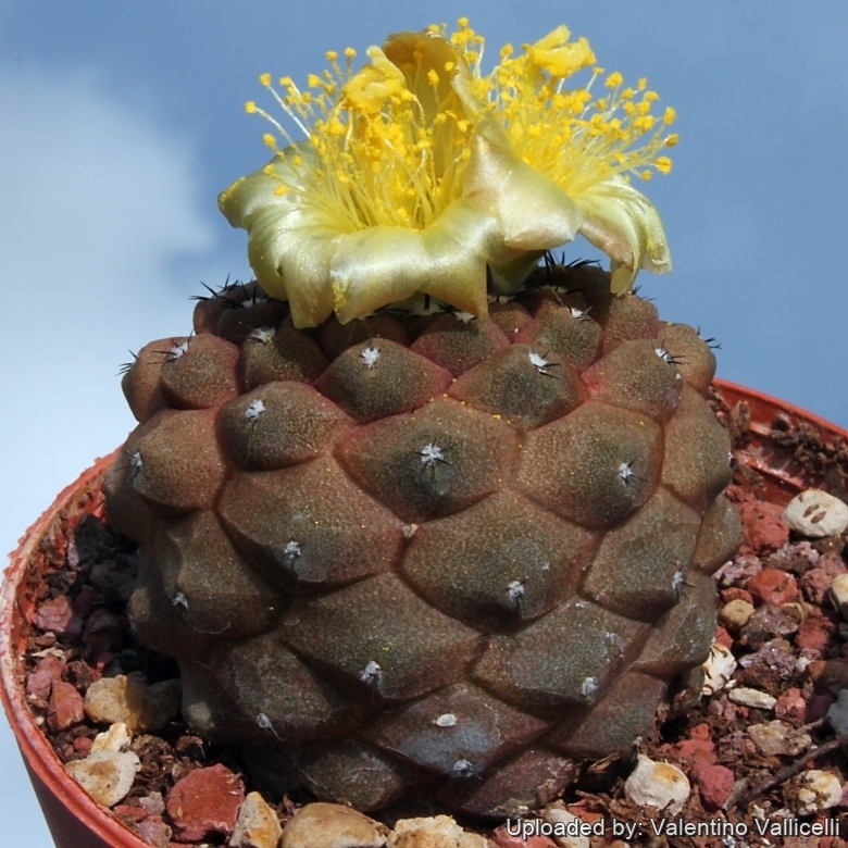 Stem: Grey-brown or more commonly bronzed, depressed-globose, 3-4 cm in diameter (up to 7 cm in cultivation), the aerial part is almost disc-shaped and almost sunken in the ground with white wool in the centre, also in the older areoles. Epidermis smooth or roughened.