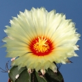 Astrophytum capricorne subs. senile cv. Krausii: has pure white spines and a yellow flower but without the typical red throat.