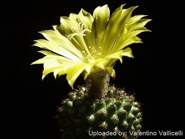Flowers: Apical, diurnal, radial, funnelform to bell shaped, light to sulphur yellow from the top of the plant, 1,7-2(-3,2) mm long 2,2-2,5(-4) cm wide. Buds with light brown wool. Tepals attenuate-acute. Stigma-lobes 5-7, to 5,5 mm very slender.