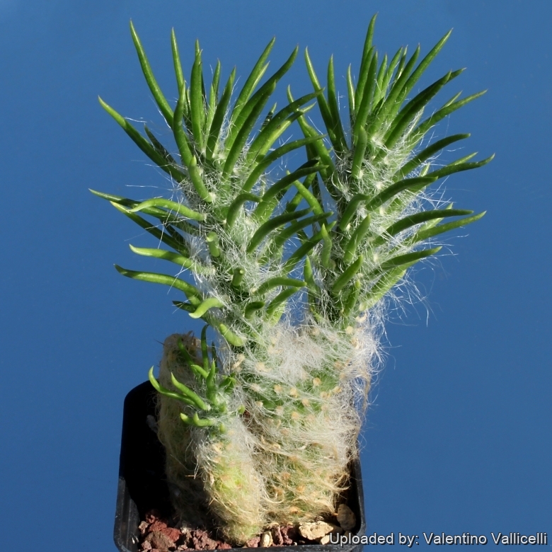 Spines: Few thin, up to 1 cm long and white. The plant has also abundant long, fine and rubbery hairs which completely cover the branches.