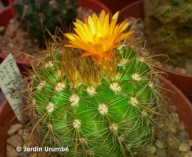 Parodia hausteiniana Rausch: is a small growing, solitary cactus to only 5 cm in diameter with yellow or amber-coloured spines. Flowers are yellow or orange. Distribution: Cochabamba near Mizque. Bolivia.
