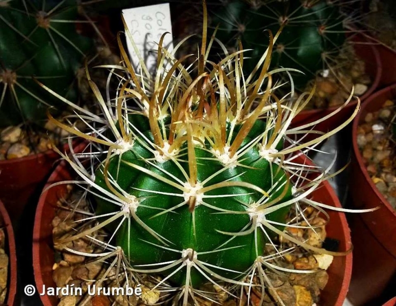 Central spines: 8-10(-12), brown, needle-like, thin, unequal 1-5 cm long. The seedlings have a number of hooked central spines which are lost as the plants mature.