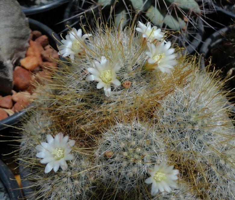 - Mammillaria crinita DC.: This taxon comprises a very variable a complex of forms, variety and species with varible spination. The flowers cream colored to a pink-cream colored. This is one of the most prolific bloomers among the Mammillarias.