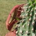 Ecology: : Pollination is done mainly by flies. This unusual pollination biology is referred to as myophily (pollination by flies). Myophily takes place in some of the following genera, Stapelia, Huernia and Ceropegia. Life for a young Hoodia plant begins under the protection of a nurse plant. A nurse plant is a shrub under which the young plant germinates and grows, protected by its leaves and branches from the suns strong rays.