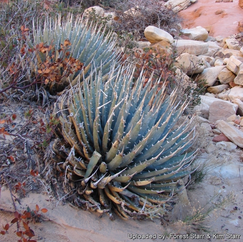Habit at Calico Hills Sandstone Quarry Calico Tanks trail Red Rocks, Nevada. December 26, 2007. (Agave utahensis) Photo by: Forest Starr & Kim StarrCultivation and Propagation: It is a very cold hardy form of the species. It is theoretically hardy to -18°C (or more) particularly when dry. It is a relative easy-to-grow species. Need a very well-drained, soil. It grows fairly fast in summer if provided with copious water but allows to dry thoroughly before watering again. During the winter months, one should only water enough to keep the leaves from shrivelling. They do well in full sun or a lightly shaded area. Plants cultivated outdoors are drought tolerant and takes blasting heat and full sun. It is a wonderful companion plant for Echinocereus and Escobaria cacti species. During the beautiful season it’s good to enrich the soil using a fertilizer rich in potassium and phosphorous, but poor in nitrogen, because this chemical element doesn’t help the development of succulent plants, making them too soft and full of water.