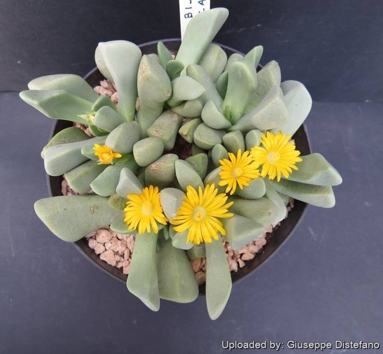 (a.k.a Bijlia cana) It is a slow growing tongue like leaved mesemb. It is notable for its midwinter show of long-lasting bright yellow flowers, organized in groups of 1 to 3.
