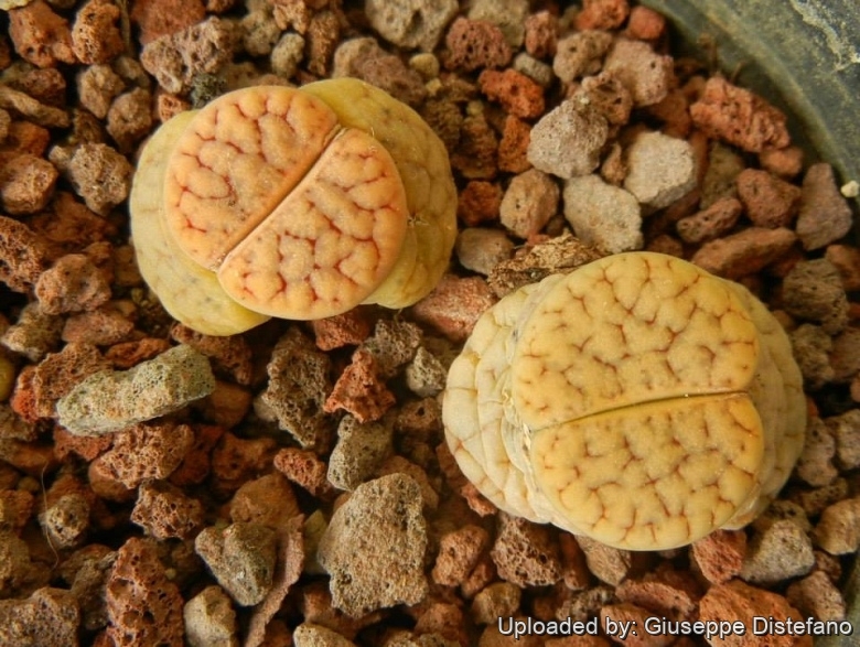 Description: Lithops gracilidelineata ssp. brandbergensis is a distinct subspecies of Lithops gracilidelineataSN|12335]]SN|12335]] recognizable for the nice ochre orange tones. The network of dark brownish-red lines, which is the prominent feature of the top surface shows a great deal of variation, not only in the way it anastomises but also in its colouration.