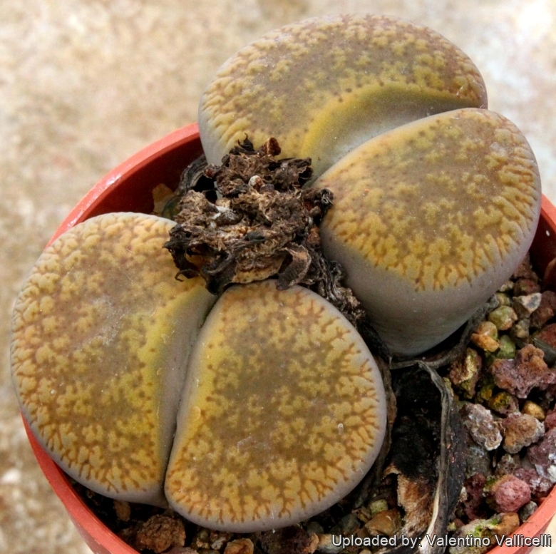 Remarks: After flowering in the autumn and extending through winter season the plant doesn’t need watering, but they will still be growing, the new bodies will be increasing in size extracting water from the outer succulent leaves, allowing them to shrivel away. In fact the plant in this time extracts water and nutrient stored in the outer succulent leaves, allowing them to dehydrate relocating the water to the rest of the plant and to the new leaves that form during this period until the old leaves are reduced to nothing more than "thin papery shells".