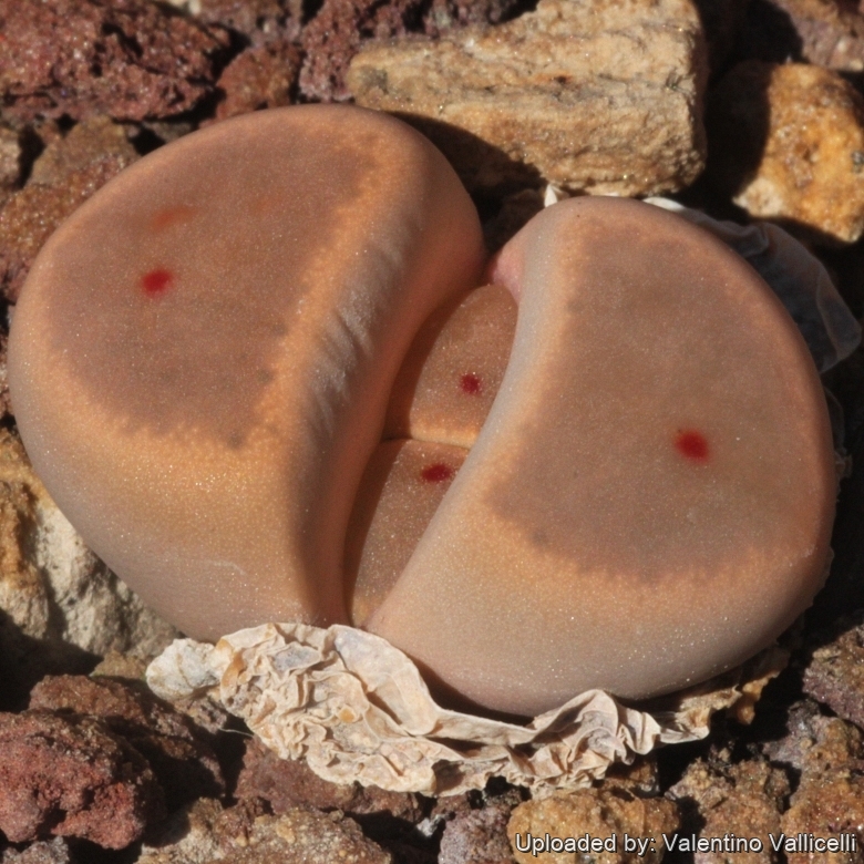 Lithops dinteri var. brevis C268 55 km SW of Warmbad, Namibia: few bright red spots.
