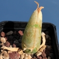 Body (paired leaves): 4,5-20 cm long, 1,5-5 cm in diameter. This plant produces two very different leaf-pairs types per season: the "active season pair", only basally connate and free for most of its length, with the upper surface more or less flat, and the "resting season pair", mitre-like (inverted cone shaped), connate for most of its length with only the tips free, this two types of leaves alternate. The resting pair (or connate pair) turns into a papery, parchment-like skin or sheath protecting the free one during the the summer inactive period and appears completely dry.