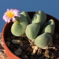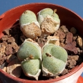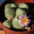 Bodies (paired Leaves): Usually less than 20 mm in diameter, pebbles-like, sharp edged almost square shaped with two short ears and more or less keeled, fleshy with raised, grey-green with dark-carmine points often converging to form a line along the margin, presenting a central fissure from which, at the beginning of growing season sprout the flower and where there appear even the new couple of leaves.