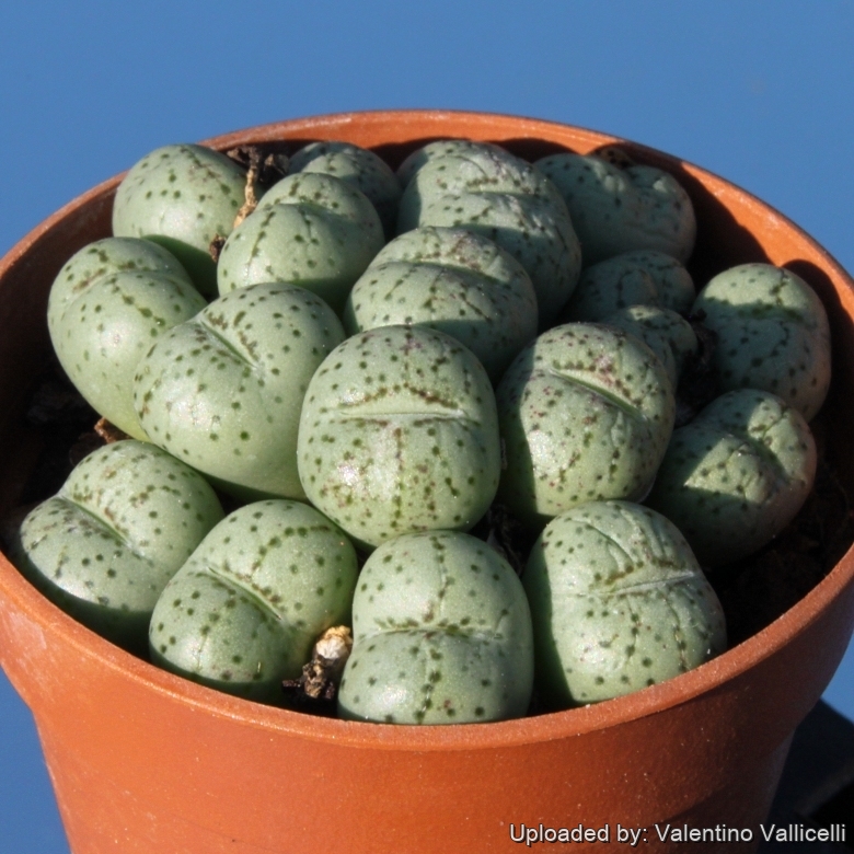 Bodies (Paired leaves): 10-12(-25) mm tall 10-12(-15) mm in diameter, globose to egg-like, apex sometimes slightly bilobed or truncate, glabrous or covered with short, thick trichomes, pale green, greyish-green, yellowish, pinkish-grey, glaucous, brownish, or bronze, with numerous dots more or less in lines on the top. In spring the colour of the old leaves fades, and they shrivel to a thin dry sheath that protects next season's growth during the summer resting phase.