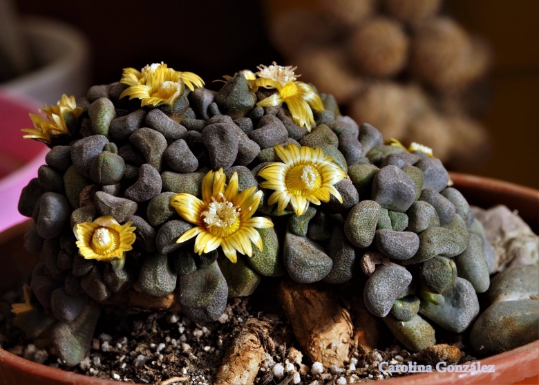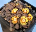 Flowers: daisy-like, silky, yellowish bronze with a file darker line at the centre of each petal and quite large compared to the tiny leaves. Should bloom at the end of winter if it gets enough light and if it is too cloudy the flowers fail to open entirely.