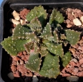 Leaves: Thick, light bluish-green to dark purple, small, finely warty and textured with white teeth on upper surface.