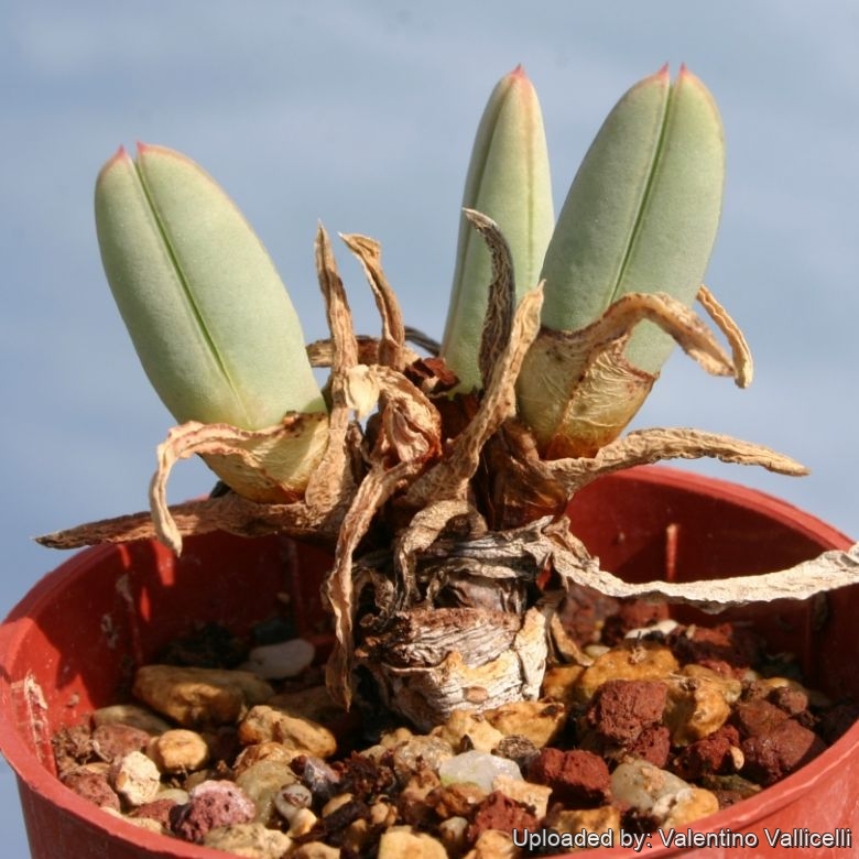 Leaves: These peculiar plants are heterophyllous, that is to say that they produce leaves of two kinds on a branch: the first pair of the season (for the summer dormant period) connate for almost half its length, sheathing over in summer and enclosing subsequent leaves; other leaf pair (during the winter) up to 4-8(-12) cm long, 13-17 mm broad, 10-13 mm thick, opposite, joined at the base, with a longer free part, keeled near the tip, mucronate, silvery green, waxed and joined with the shorter drier outside pair framing the larger younger inner pair. Free parts trigonous and papillate in both types, but more densely so in younger.