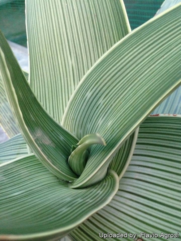 Leaves: Smooth, soft, broad- to narrow-lanceolate, curved, pale blue-green, greyish-green to greyish-yellow without markings and conspicuously or obscurely marked with longitudinal dark-green lines. In full sun the leaves take on a pink cast with dark reddish striations. Margin 2 - 3 mm dull white, usually thornless, sometimes crenulate with small teeth (Aloe striataSN|685]]SN|685]] usually is smooth along the leaf edges).