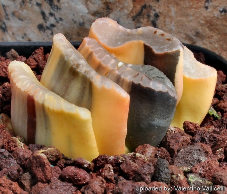 Leaves: The leaves look as if they have been roughly cut off at the tops and they are arranged like a fan, not a rosette. As the plant grows take on an almost crested appearance. The leaf size and thickness, of the end-areas will vary greatly from clone to clone. The surface is warty and the blunt end is transparent whit some interesting leaf markings, others are rather plain, this "lightning flash" patterns in the leaves do not come out until the plant reaches maturity.
