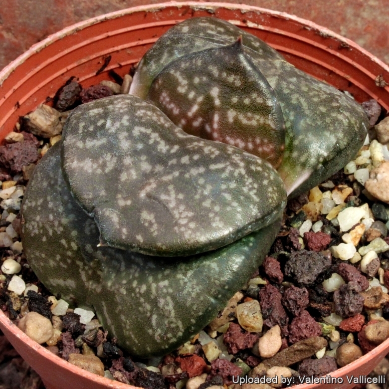 Habit: It is a distinctive neotenic miniature succulent with short, rounded and thick distichous rosettes of two to four leaves up to 10 in diameter. Old specimens cluster naturally with new plants around the original. It is very slow growing.