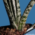 Leaves: More or less vertical 20-30 cm tall, narrow 1,3-2,5 cm wide at the base, rigid, straight, long-ligulate, ensiform/acinaciform . The leaves in section are unevenly triangular flat on the upper side, rounded often with 2 keels beneath. They are glabrous, glossy, grey-green to dark green (in intense light reddish-green) and beautifully marbled with conspicuous bright creamy-white spots that are smooth or slightly raised and warty and frequently merge in traverse irregular crossbands giving a even more brighter appearance. Apex attenuated, acute/mucronate. Margin horny, white.
