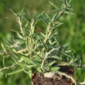 Leaves: Scattered on long shoots and in sessile fascicles (short shoots), the latter from axils of the former, all lanceolate to linear-lanceolate, acute, mucronulate, with margins recurved, up to 2-4 cm long and 2-7 mm broad, leathery, slightly rough above, loosely hairy below, particularly along the midrib. Margin recurved. Stipules spiny, those of the long shoots spreading, 6-18 (rarely to 25) mm long, fine, springing from an almost square leaf-cushion, usually under 2 mm high, those of the short shoots much shorter.