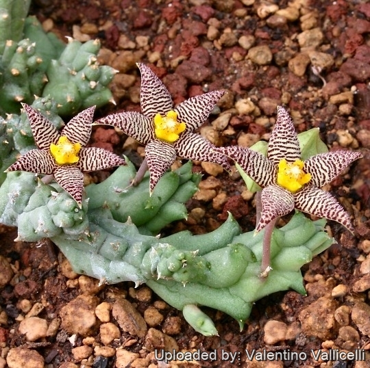 Flowers are five-pointed fleshy stars varying from whitish, yellowish, reddish or bright brown, with or without brown-red dots or transverse lines sometime condensed to a more or less plain colouration. It is very variable.