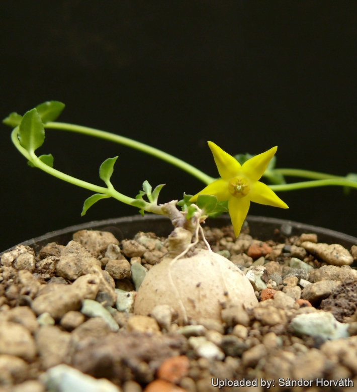 Cultivation and Propagation: In cultivation the plants are usually grown in semi shade, with the tubers wholly or (preferably) partially exposed to prevent scorching and rotting of the roots. This plant can take a good deal of water during active growth and should be watered only when not dormant. Keep dryish in winter. It should be overwintered in the greenhouse at temperatures over 12°C (avoid letting temperatures drop lower than 5° C). Use a very draining but rich soil. An error in cultivation may produce unsightly holes in the tuber.