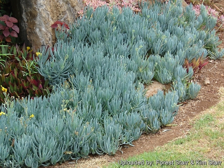 Read More... Cultivation and Propagation: This plant grows as a groundcover and makes a very ornamental pale blue colouring in full sun in warm climates. It's fresh new winter growth provides extraordinary form and colour contrast in the landscape when placed either with other succulents (e.g. yellow Sedum) or in a mixed planting to contrast with anything orange, from terracotta pots to California poppies. It also pairs beautifully with red-leaved aloes, lavender 'After-glow' echeverias, fire sticks (Euphorbia tirucalliSN|23187]]SN|23187]]`Sticks on Fire'), elephant's food (Portulacaria afraSN|18165]]SN|18165]] f. variegata), and burgundy-leaved “Aeonium arboreumSN|149]]SN|149]] var. atropurpureum cv. Schwarzkopf (Zwartkop)”; and with nonsucculent companion plants such as ivy geranium, parrot's beak, and African daisies (Gazania species). It is drought tolerant, but will accept irrigation. Similar in appearance but not as common is Senecio serpensSN|18205]]SN|23938]], which is a better choice, if you can find it, for small beds and containers. Leaves are less than half the length of those of Senecio mandraliscaeSN|18205]]SN|18205]].