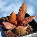 Leaves: Green to reddish-brown or purple (depending on clones, growing conditions and seasons), unspotted, becoming grey and waxy as they ages, petiolate, short, almost spherical to elongate lanceolate or oblanceolate, tapered at both ends and roundish in cross section or slightly concave above, 1,5 to 3,5 cm long, very irregularly warty (tubercled) and slightly caniculate (grooved) in the upper part. Margins absent or brownish or white, raised and more or less horny especially near the tip.