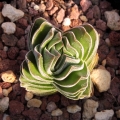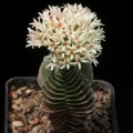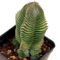 Leaves: Silvery-grey to greyish-green, scale like, very thick and wide heart-shaped which turn up at the ends. They are densely stacked, each leaf overlapping somewhat and form square columns approximately 4cm wide. The light, white powdery surface helps to preserve moisture and protect from strong sunlight.