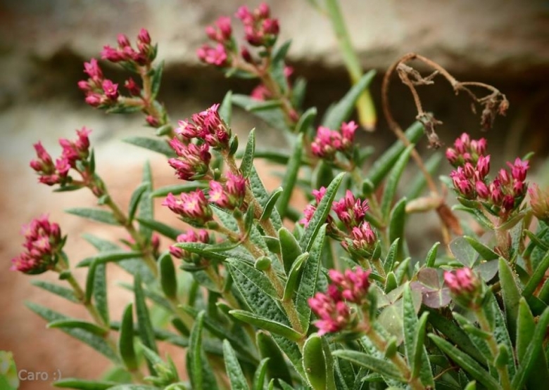 Flowers: Star-shaped, rose to bright pink-red to 4 mm across, in false umbels often as much as 5-6 cm width. Flowering stems hairy.