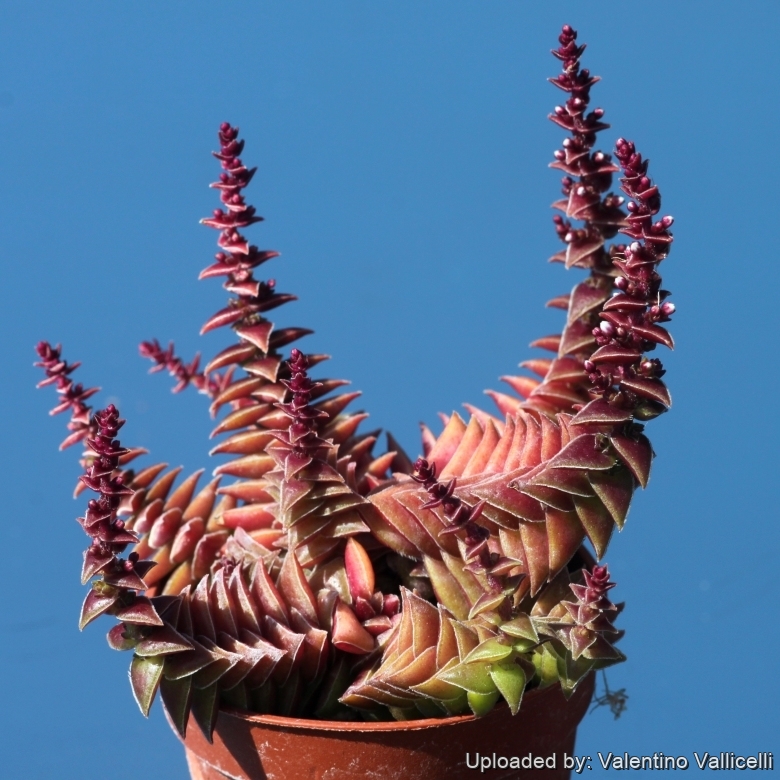 Resembles a miniature, clumping form of Crassula capitella. Very unique form, with leaves neatly arranged in four ranks in shades of red, purple, and green. White blooms.