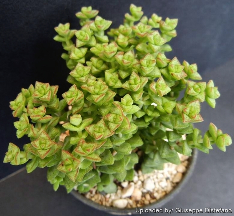 Leaves: Tiny only about 5 x 4 mm, grass green, very thick and packed tightly in opposing ranks along the stem with the triangular tips outlined with a row of light maroon or red spotting especially in bright light. Internodes not visible.