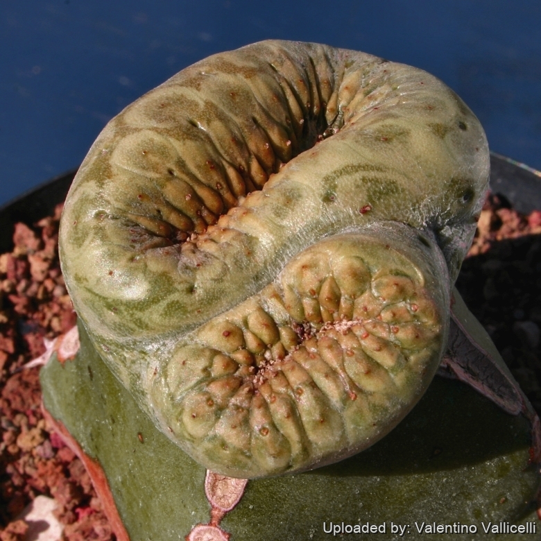 Stem: Spherical with a short obconic caudex about 4 cm tall x 6-8 cm in diameter, it grows almost buried in the soil and has lost all its spines. The apex is depressed an the epidermis is smooth, shining. Usually it has a single growing point, but in cultivation the plant can branch dichotomously forming two to several apexes.
