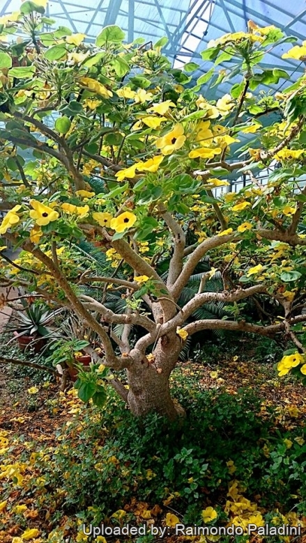 Description: Uncarina grandidieriSN|18294]]SN|15877]] is a multibranched shrub or small pachycaulescent tree that may ultimately attain a height of 3-5 meters and 80 cm girth. The flower resembles a large Petunia in form and is bright yellow with a dark throat, as in the "Black Eyed Susan Vine" (Thunbergia alata) and give way to green fruit covered in otherworldly spines. The stems are stout and become thickened with age. The leaves resemble those of the cotton plant (genus Gossypium) and are fuzzy and are sticky to the touch, yielding a musty odour when rubbed. The leaves are deciduous during the winter resting season.